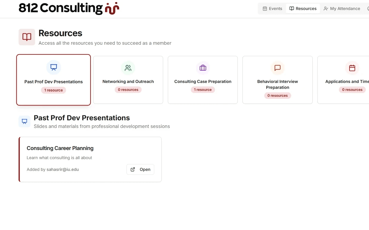 Designed and deployed a full-stack internal platform for the consulting organization I'm a part of at IU. Created features for event logistics, resource sharing, and member engagement. Everything the organization needs, all in one place. Built end-to-end using Cursor and Firebase (for authentication and data storage). Deployed and hosted on Vercel.